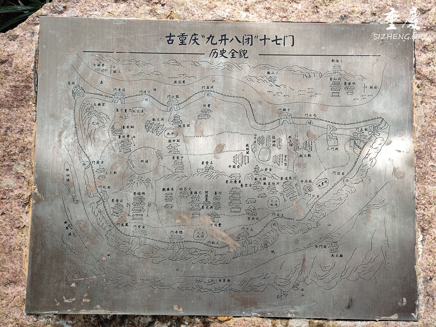 明洪武四年(1371年)重庆卫指挥使戴鼎所筑重庆城为石城,城墙全部用条石砌成,共开设了十七个门,其中九个门可以正常打开,八个门关闭,无法打开, 象征“九宫八卦”。九开的城门分别是朝天门、东水门、太平门、储奇门、金紫门、南纪门、通远门、临江门、千斯门。八闭的城门是翠微门、金汤门、人和门、凤凰门、太安门、定远门、洪崖门、西水门。