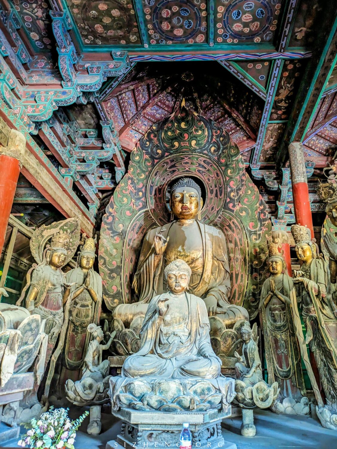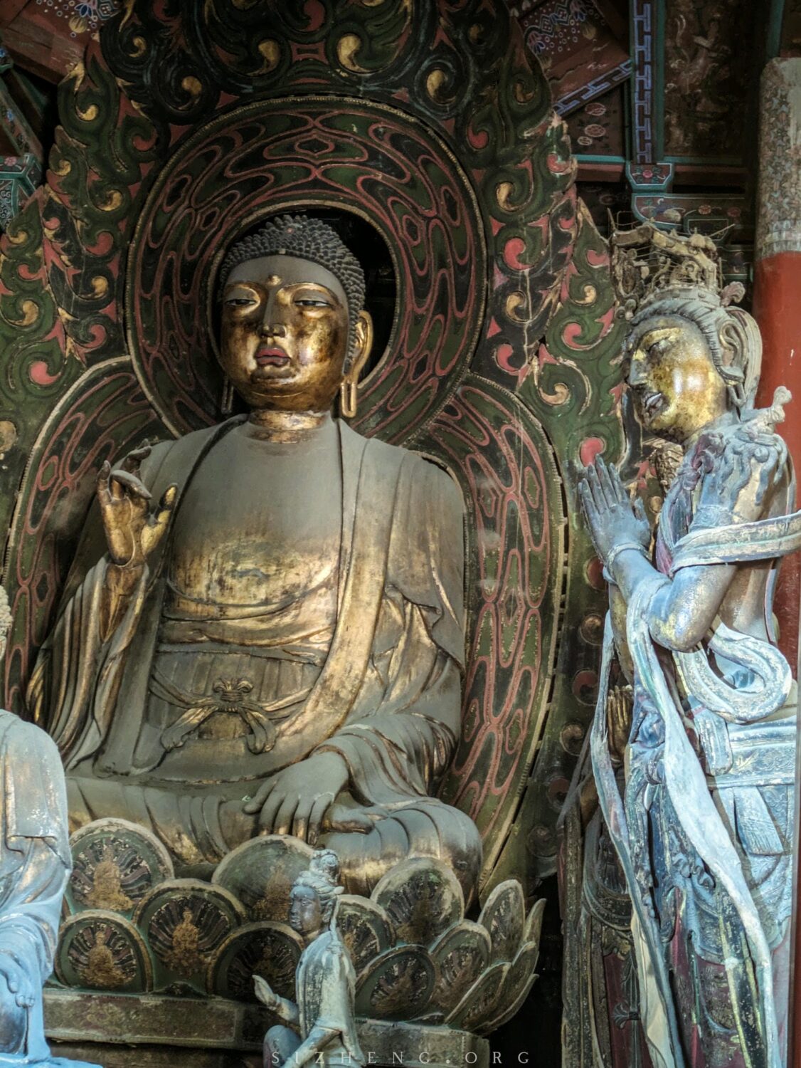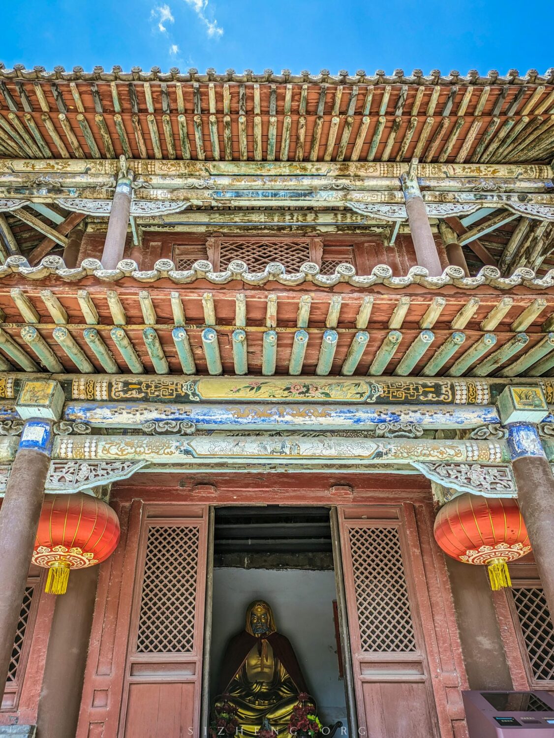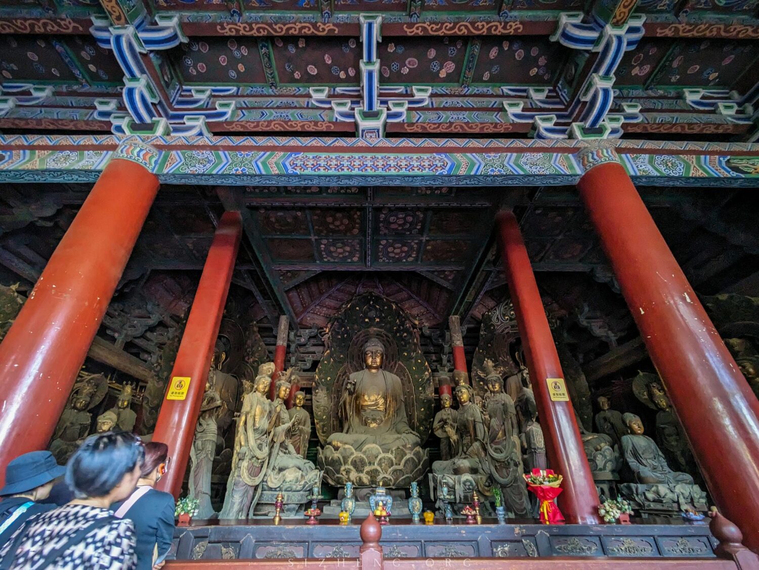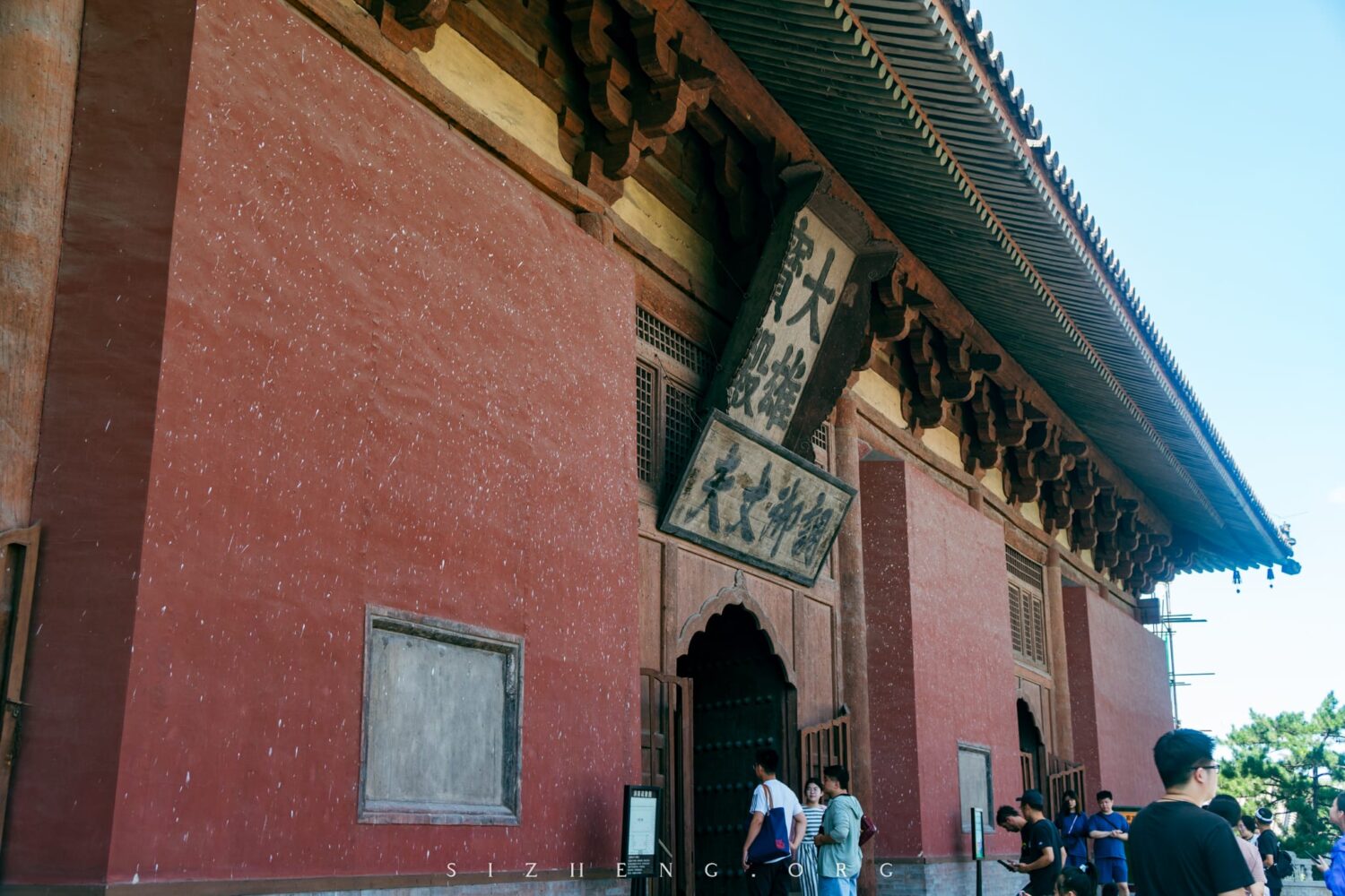 这座单檐庑殿顶的大雄宝殿是始建于辽代,毁于兵火后在金代又旧址重建,它是中国现存规模最大的古代木构佛殿建筑。不得不说,大雄宝殿真的是十分宽大啊,手机广角都照不全,站在殿前,压迫感就很重了。仔细看它门的形状是不是很特别?这叫做壸kūn门10,是中国现存最古老的壸门。