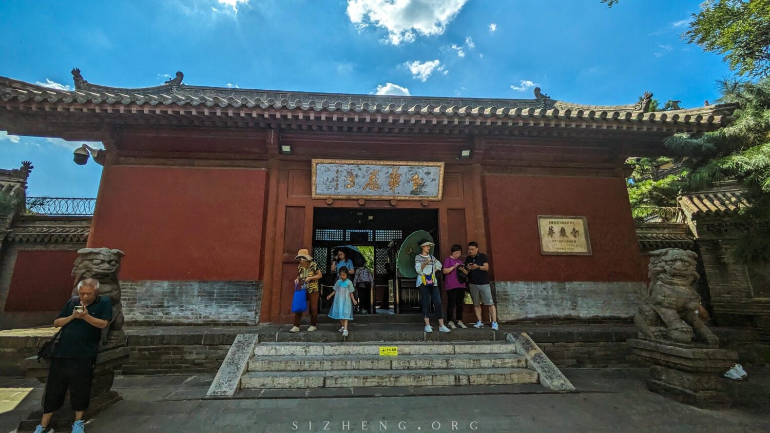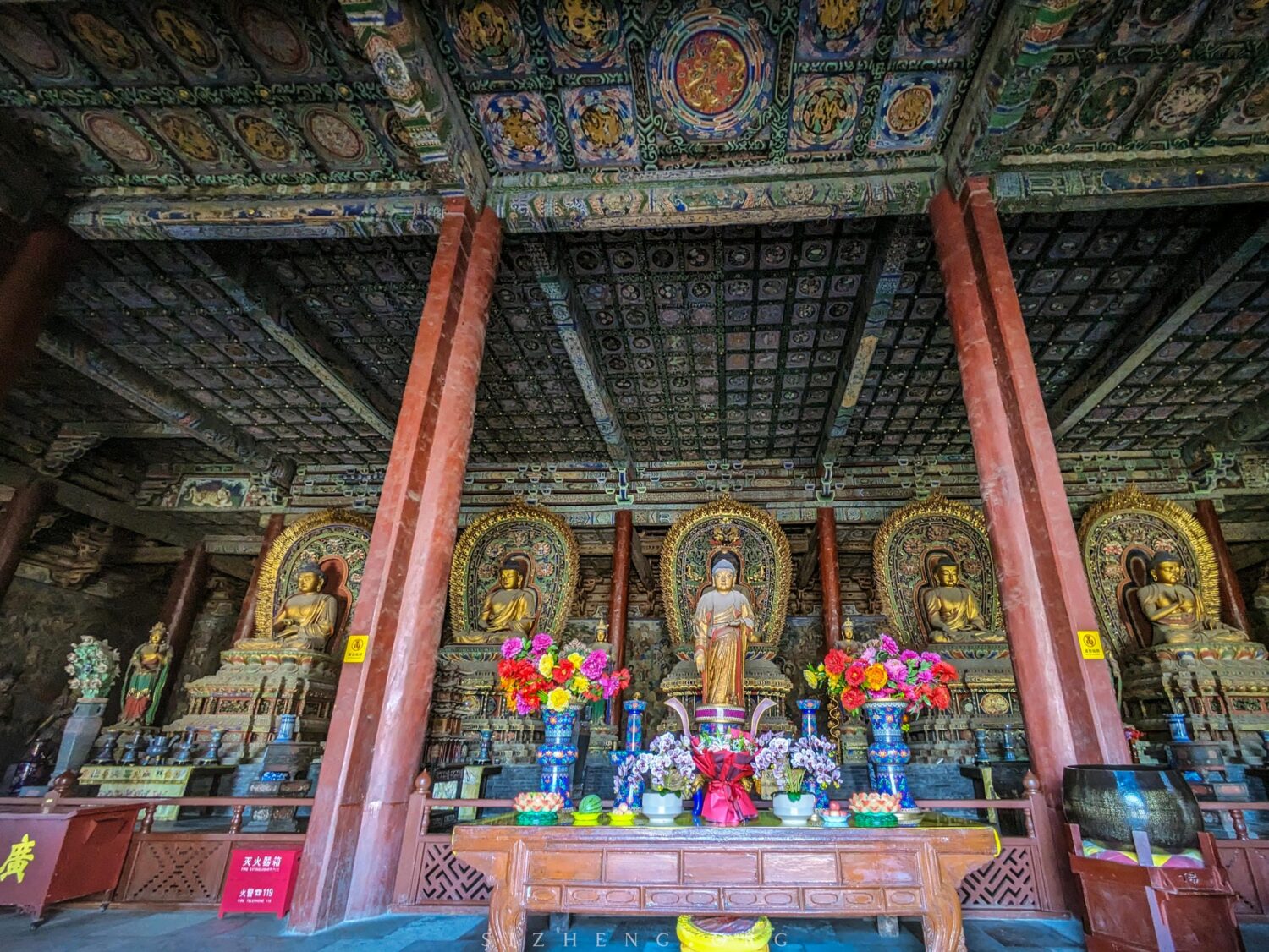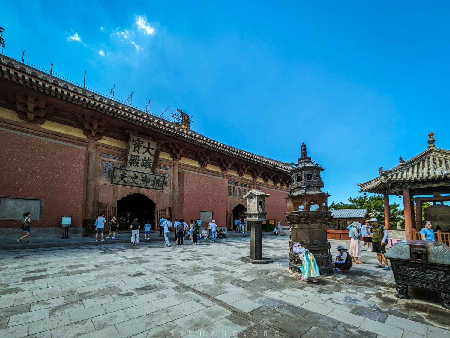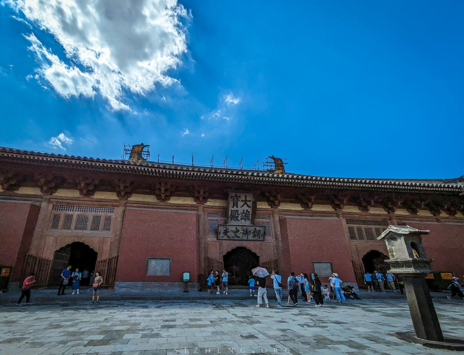 这座单檐庑殿顶的大雄宝殿是始建于辽代,毁于兵火后在金代又旧址重建,它是中国现存规模最大的古代木构佛殿建筑。不得不说,大雄宝殿真的是十分宽大啊,手机广角都照不全,站在殿前,压迫感就很重了。仔细看它门的形状是不是很特别?这叫做壸kūn门10,是中国现存最古老的壸门。