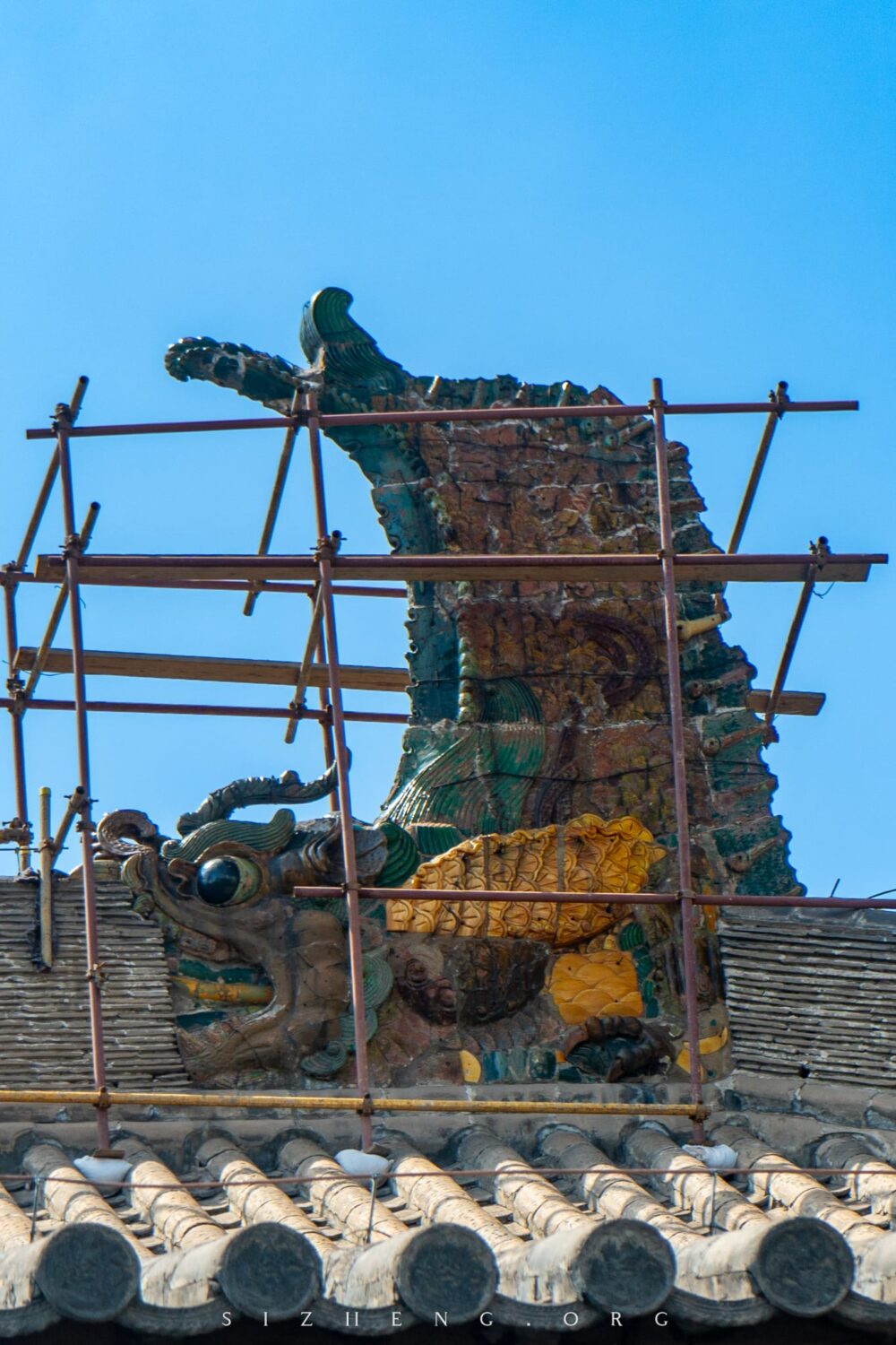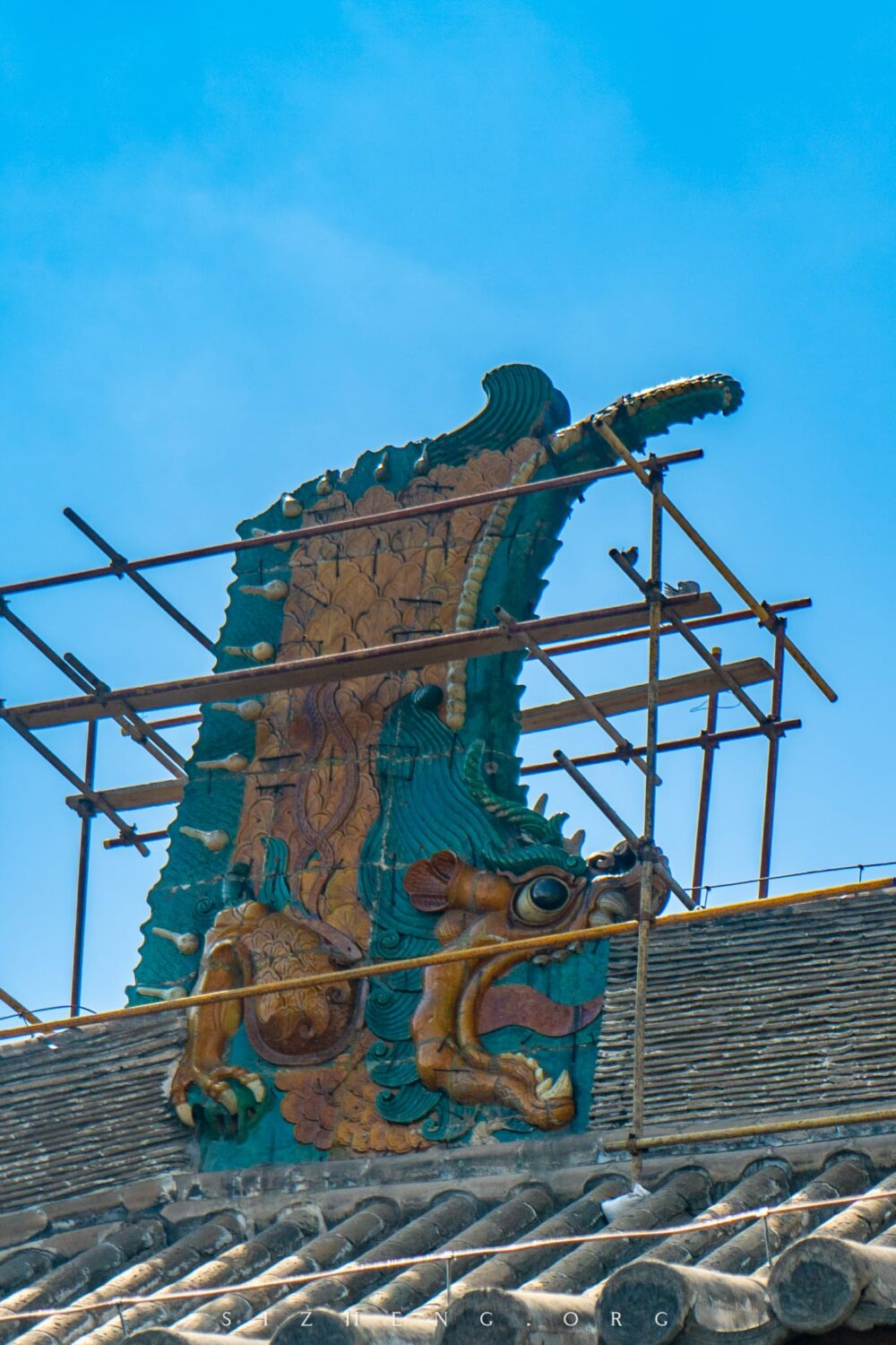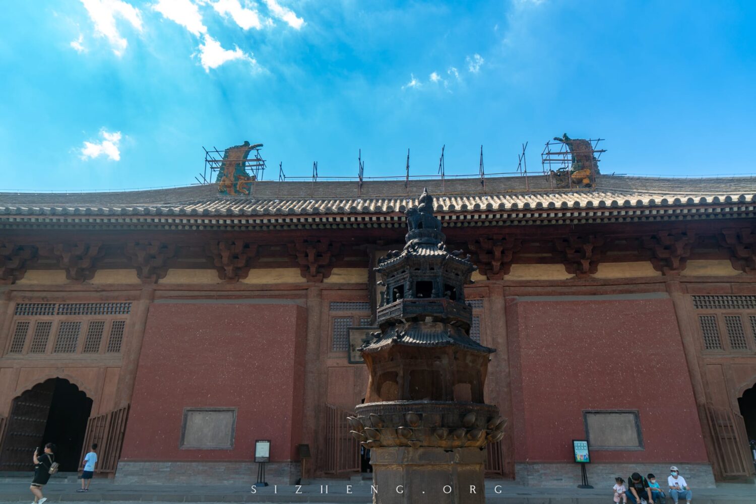 再看大雄宝殿屋脊的鸱吻,是中国现存古建筑中最大的琉璃鸱吻,其中一个是金代的遗物,另一个则是明代的遗物,现在正在维修中。
