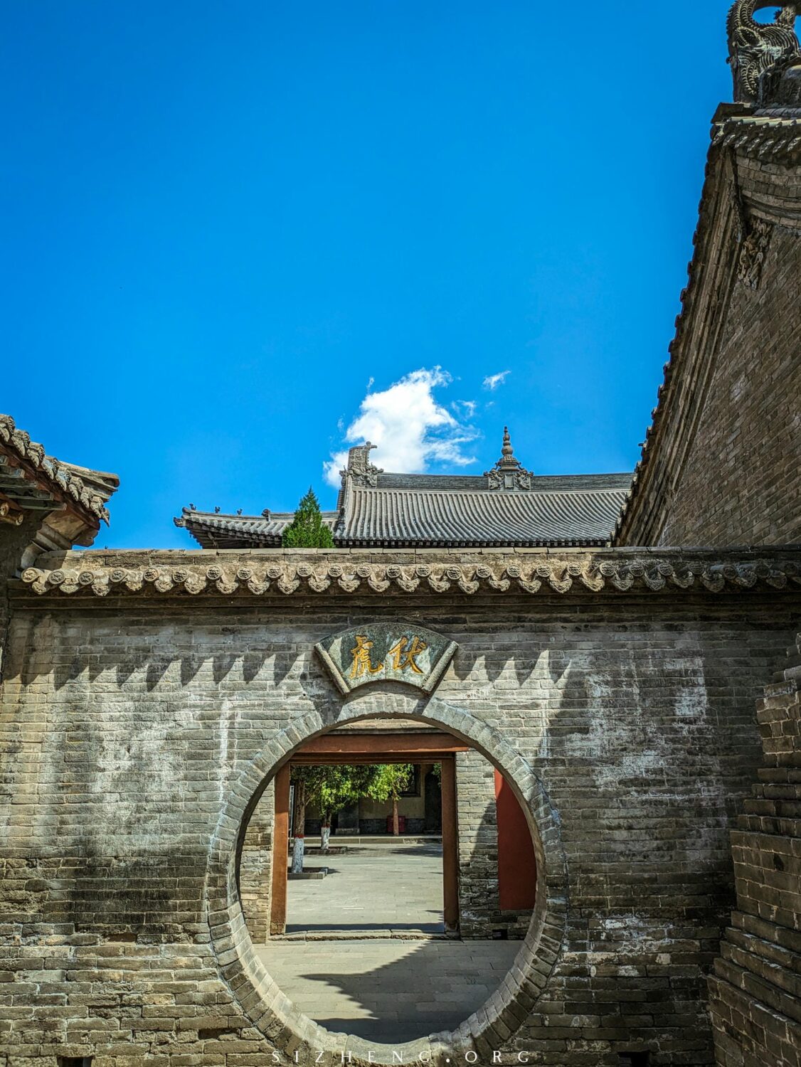 进入山门是第一进院,过殿立于台基上,两侧方门门楣上刻着“拈花笑6”和“击竹闻7”。话说这“击竹闻”三字居然能被很多人认错?!把“擊”认作“擎”,“聞”“間”不分,真的是简体字教育推行得太成功了……更不用提其出典又有多少人能听过呢。而在其后的圆门上则是“藏龙”和“伏虎”。