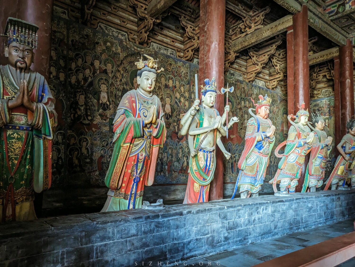 大雄宝殿内供奉有明代佛像,正中是五方佛,两侧同样是护法诸天。五方佛的中间三尊是木雕,两侧的两尊是泥塑,你看出来了吗?诸天塑像也很特别,身体都向前倾,这种样式小雪从未在其他地方见过。墙上的壁画是清代补绘的,也很好看。