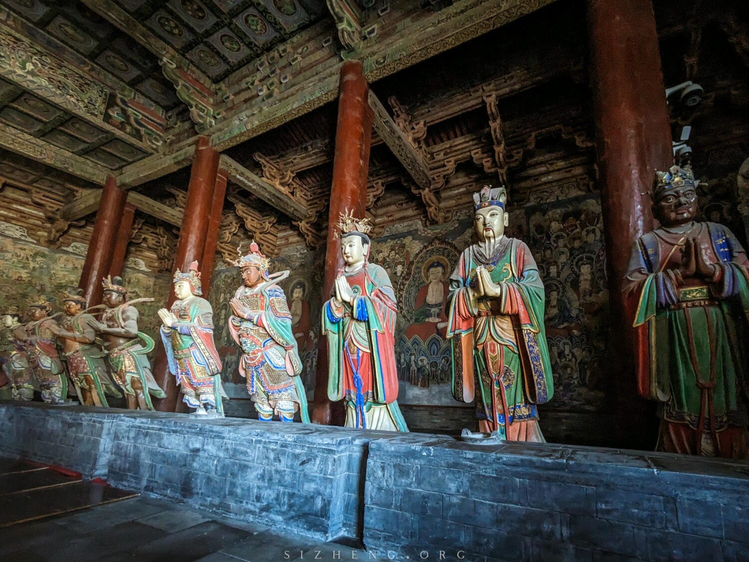 薄伽教藏殿内也不乏珍品,大部分是辽代彩塑,也有明代塑像,其中最出名的是“合掌露齿”的胁侍菩萨,小雪很好奇它刚上完油彩会是什么样子。薄伽教藏殿后壁正中间还悬一天宫楼阁,是国内现有的唯一辽代木构建筑模型,但光线很黑,拍不了,大家可以去看看网上的图。天宫楼阁两侧有拱桥与左右藏经阁的廊道相连接,基本也是看不清楚的,只是知道有。