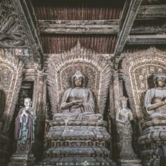 薄伽教藏殿内也不乏珍品,大部分是辽代彩塑,也有明代塑像,其中最出名的是“合掌露齿”的胁侍菩萨,小雪很好奇它刚上完油彩会是什么样子。薄伽教藏殿后壁正中间还悬一天宫楼阁,是国内现有的唯一辽代木构建筑模型,但光线很黑,拍不了,大家可以去看看网上的图。天宫楼阁两侧有拱桥与左右藏经阁的廊道相连接,基本也是看不清楚的,只是知道有。
