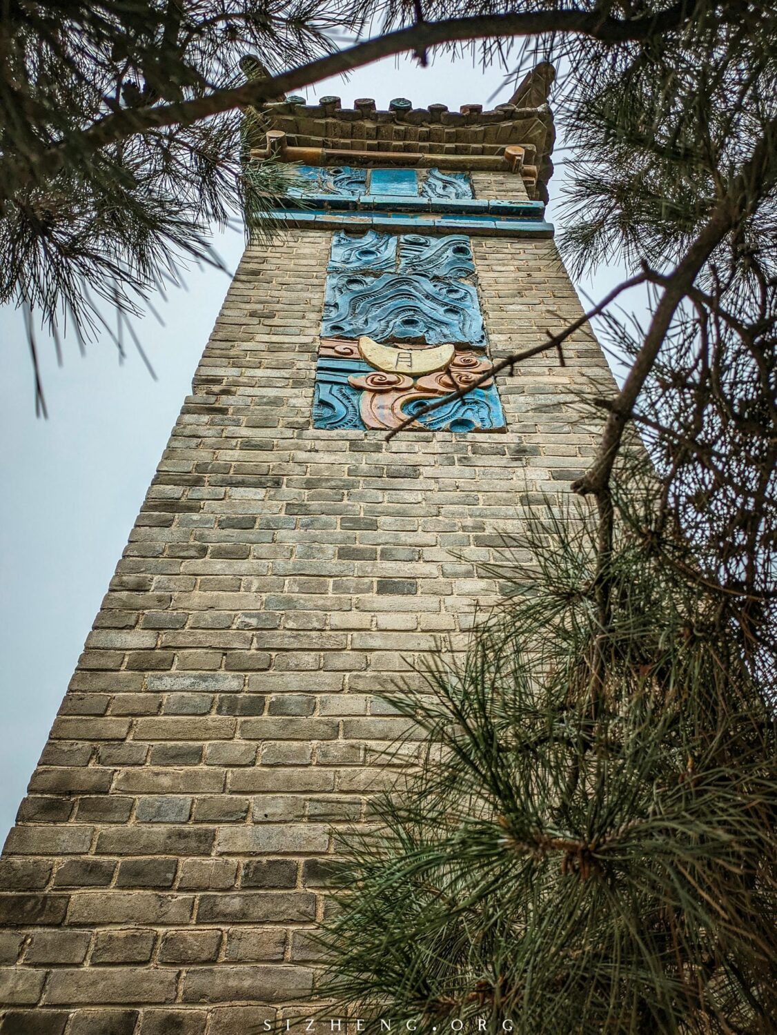 导游介绍说,壁底的须弥座由15层琉璃砖组成,而束腰部分有两层琉璃神兽。上层是二龙戏珠图案的琉璃砖雕,共41组;下层由多种琉璃走兽构件组成,有大象、鹿、狮虎、玉兔、狗、羊、飞马等,每个动物都有自己的背景,中间用竖石隔开,形成了独立的画面。