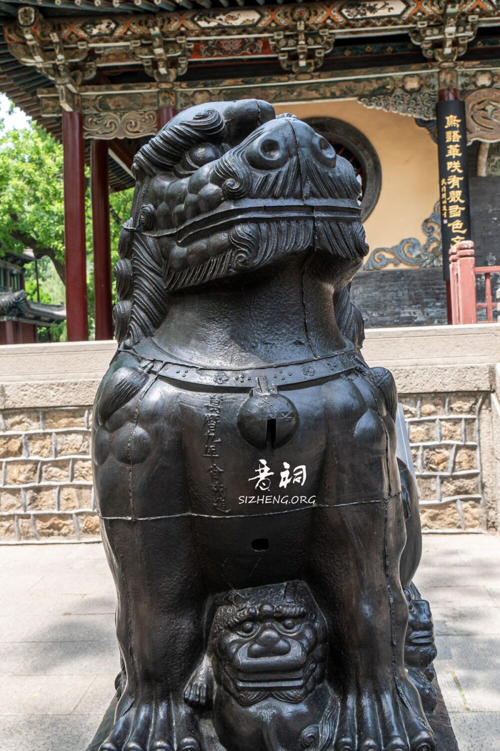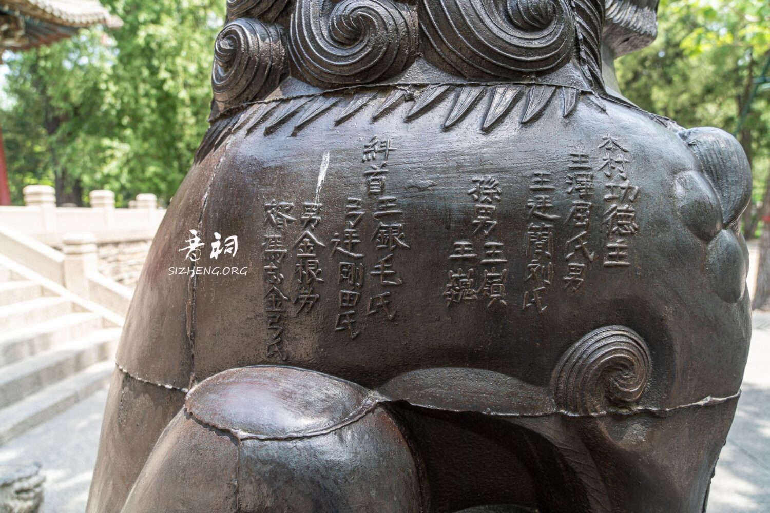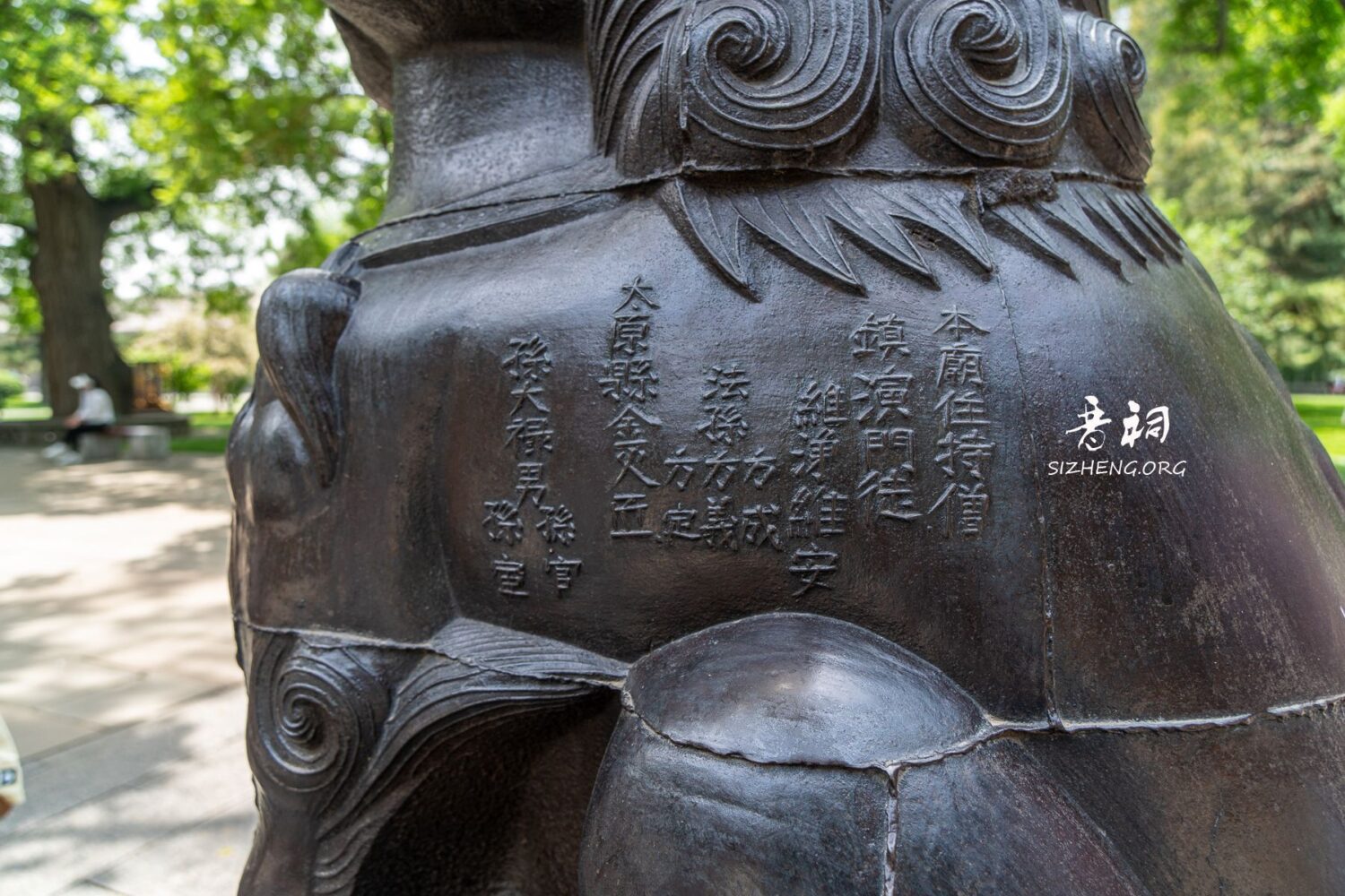 高台前还有两尊清万历年间制造的铁狮子,玩绣球的是公狮子,踩着小狮子的是母狮子,上面刻有“本村功德主王澤2屈氏男,王〇簡刘氏,孫男王嶺、王巍,紏首3王銀毛氏、弓〇剛田氏,男金根勞,婿馮志金弓氏”,“本廟住持僧鎮演門徒,維淨、維安,法孫4方成、方義、方定,太原縣金火匠5孫大祿男孫官、孫宦“等铭文。