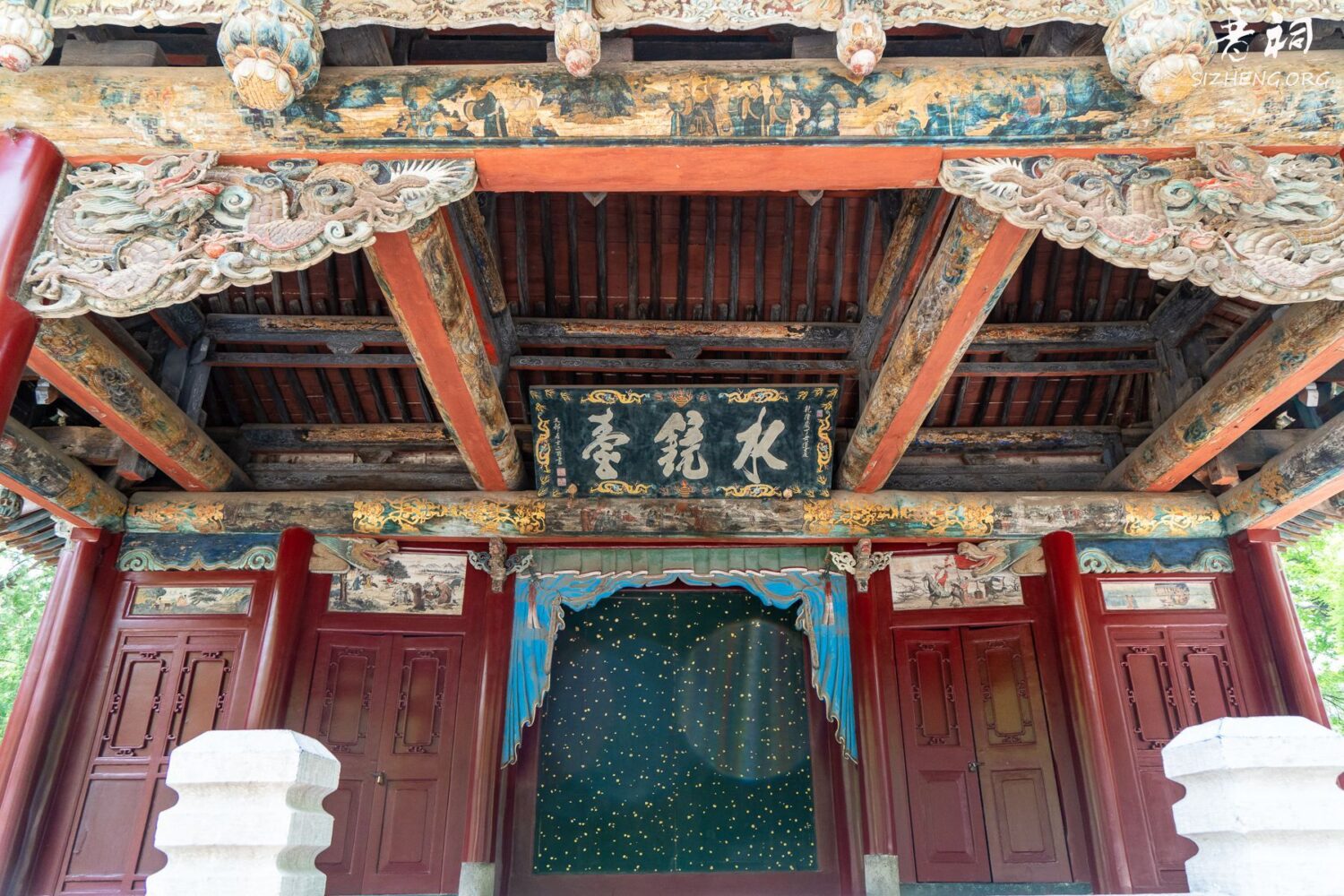 绕到水镜台的另一面,是一个卷棚歇山屋顶的戏台。台中间的匾额是清乾隆翰林杨二酉所题的“水镜台”,是晋祠三大名匾之一。“水镜”二字源自《汉书》中“清水明镜,不可以形逃6”的典故,而无知的小雪只联想到“镜花水月”。
