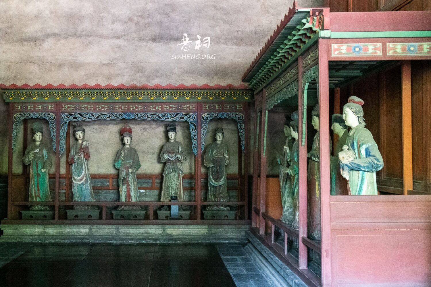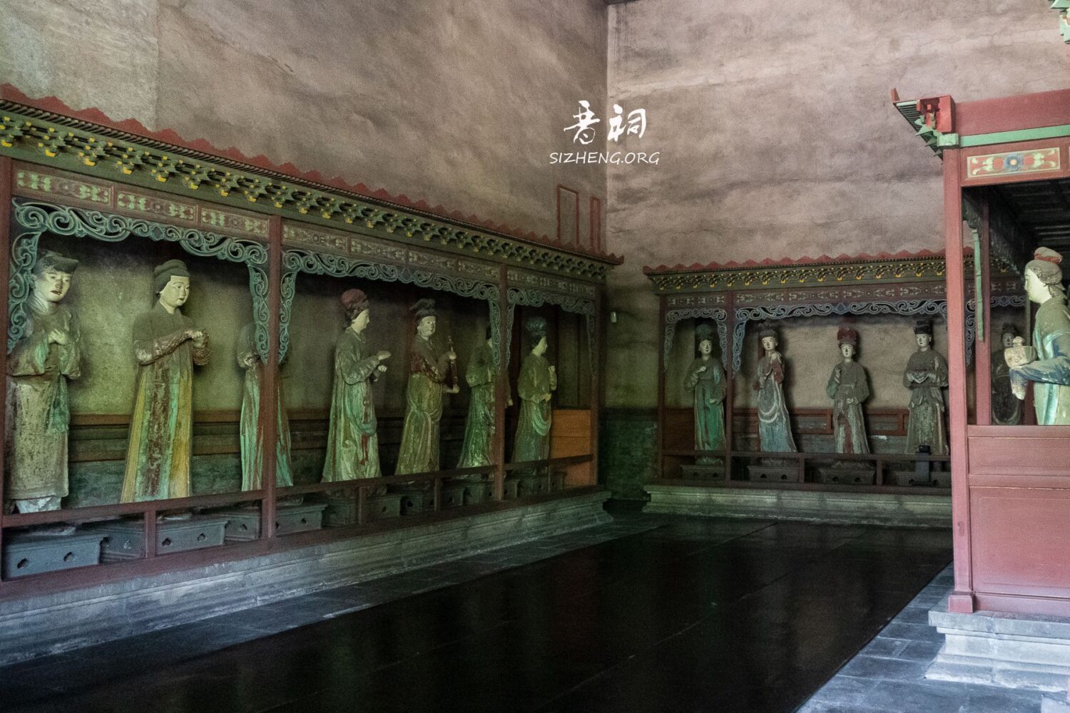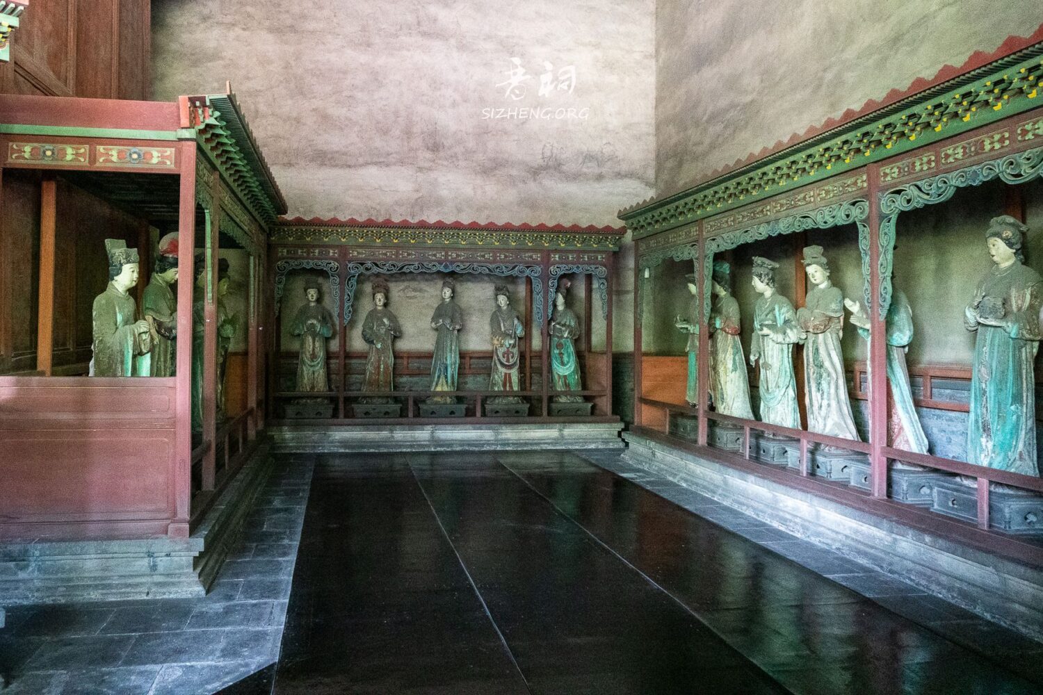 殿内帐中是的凤冠霞帔、雍容华贵圣母坐像。 两侧是两尊内侍的立象,身体微微向内倾,颇有婢膝奴颜的感觉。四周还有三十几尊侍女立像,身高大小与真人无异,外貌年岁大小不一,有青年有中年,姿态自然,表情动作各不相同,所任职位,表现身份也不同,据说她们是根据宫廷“六尚17”塑造的 。当然了,这些像经后代妆銮,已非原貌。那反正又不让近距离观看,殿内又黑漆漆的,塑像本身虽说经过翻修,但不知道是不是山西的自然环境太恶劣的缘故,都灰扑扑的。据说当年梅兰芳先生还曾到此反复揣摩某个侍女的表情呢,小雪怎么都看不出来个所以然而。这些宋代彩塑是晋祠三绝之一。