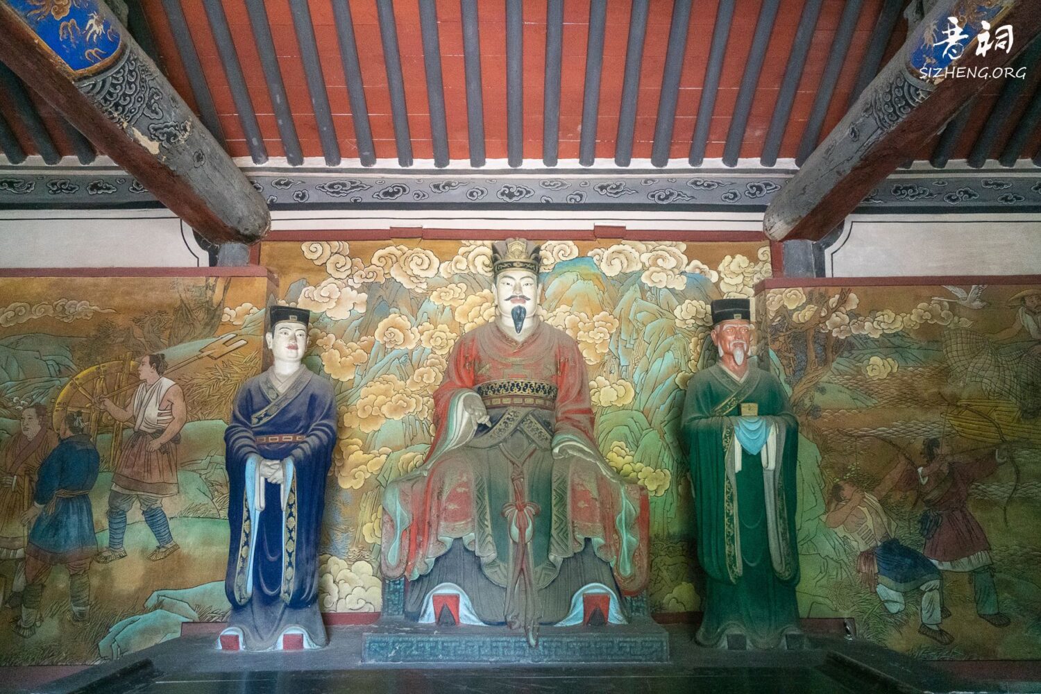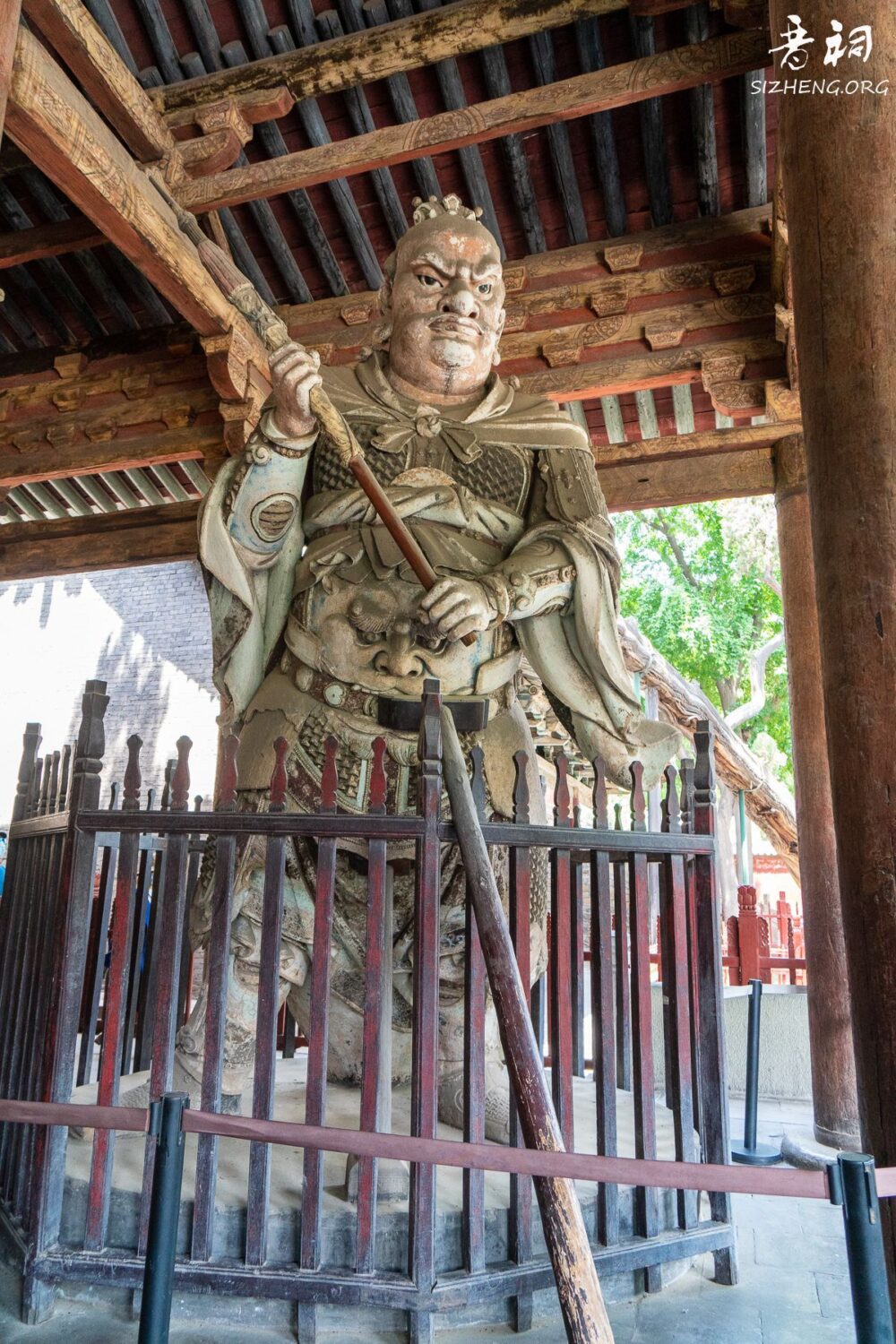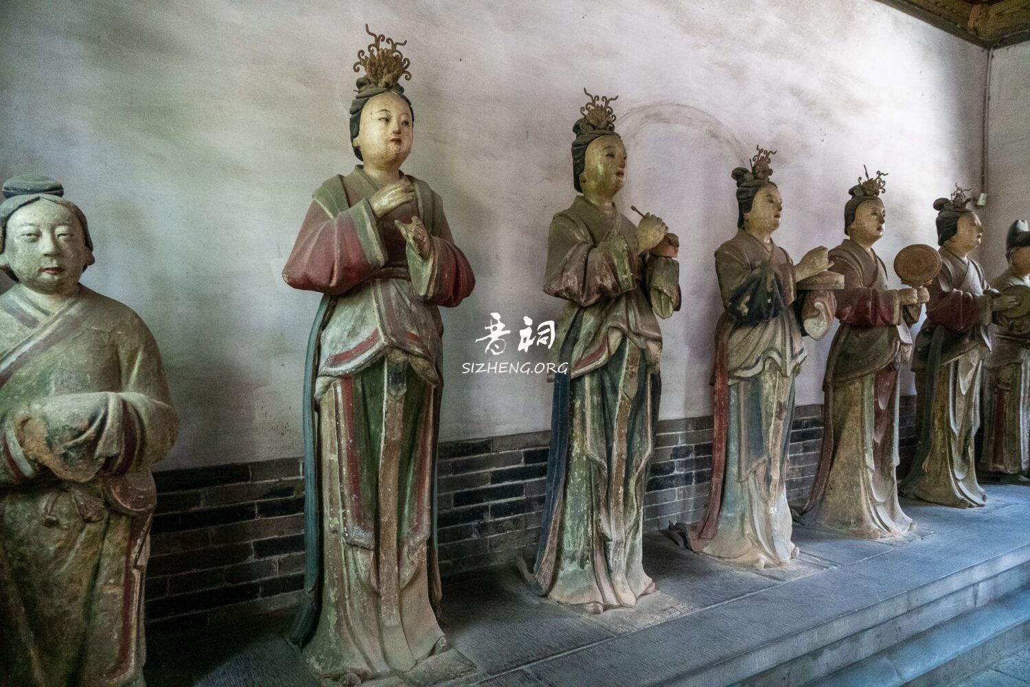 殿内帐中是的凤冠霞帔、雍容华贵圣母坐像。 两侧是两尊内侍的立象,身体微微向内倾,颇有婢膝奴颜的感觉。四周还有三十几尊侍女立像,身高大小与真人无异,外貌年岁大小不一,有青年有中年,姿态自然,表情动作各不相同,所任职位,表现身份也不同,据说她们是根据宫廷“六尚17”塑造的 。当然了,这些像经后代妆銮,已非原貌。那反正又不让近距离观看,殿内又黑漆漆的,塑像本身虽说经过翻修,但不知道是不是山西的自然环境太恶劣的缘故,都灰扑扑的。据说当年梅兰芳先生还曾到此反复揣摩某个侍女的表情呢,小雪怎么都看不出来个所以然而。这些宋代彩塑是晋祠三绝之一。