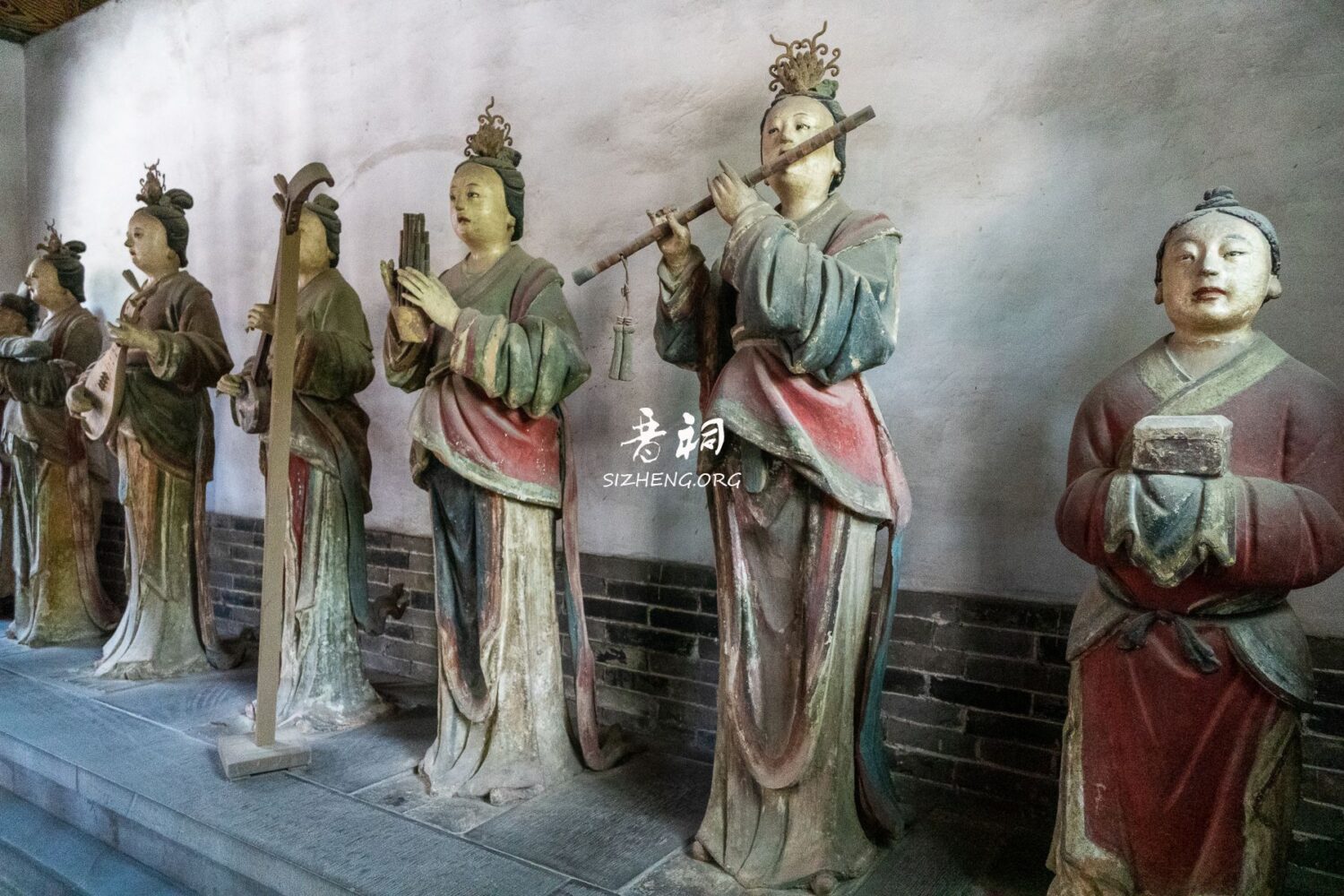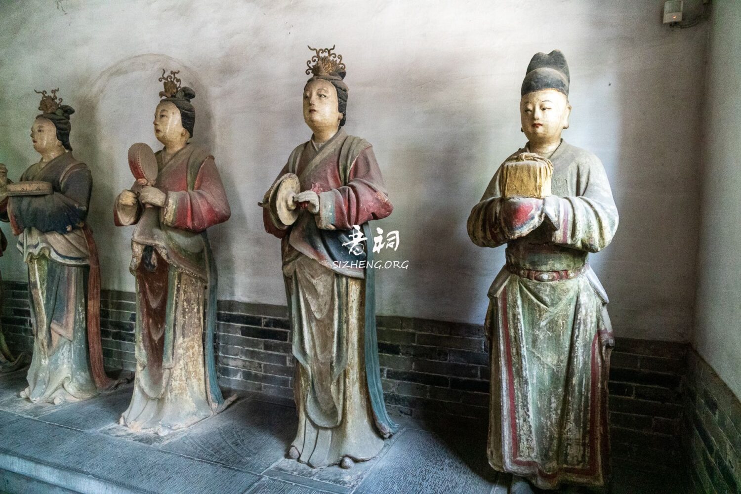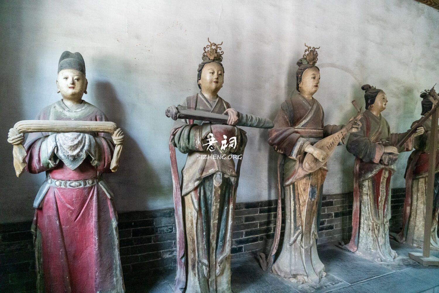 第一进院落的廊内立有石碣40余块,为宋、金、元、明、清历代题咏。正面享堂建于1950年代,为单檐卷棚顶、面宽三间、进深三间的建筑。享堂内分列有14尊元代乐伎塑像,这些塑像都是建国后移来此处保存的。东边是陈列的管弦乐乐伎塑像 ,分别手持奏册、六弦琴、琵琶、三弦、笙、横笛、印笏。西边是打击乐乐伎塑像 ,分别手持黄包、叉、手鼓、钹、锣,有两尊塑像手中物品缺损。