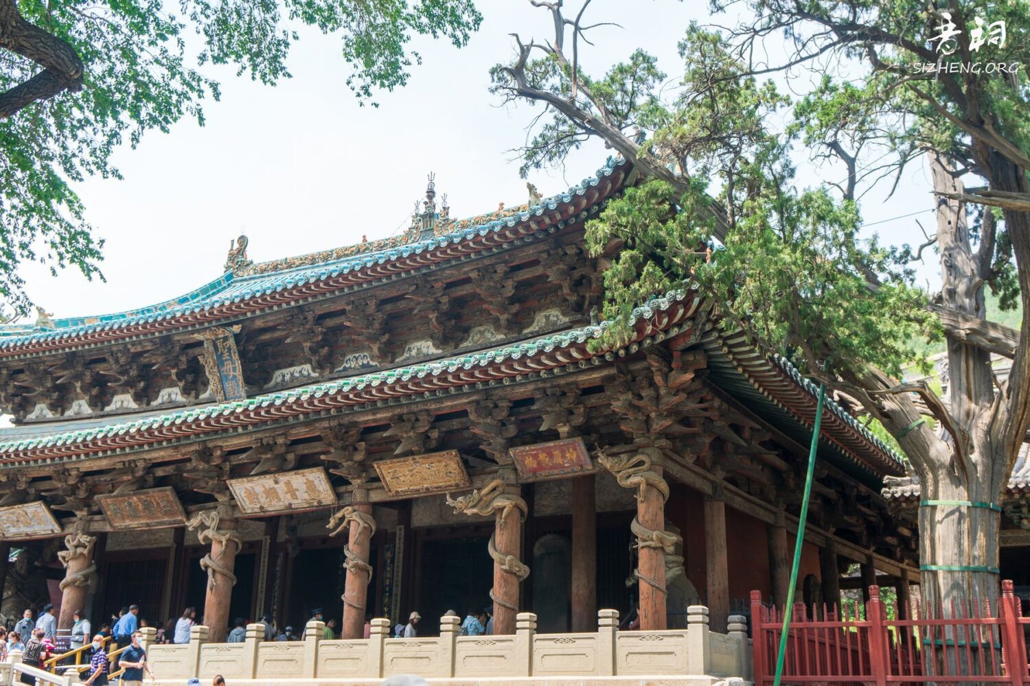 走近了看,圣母殿殿周围廊有少见的两间宽,是我国现存古建筑中“副阶周匝15”的最早的实例。前廊中的檐柱上有八根立体木雕盘龙,造型各异,中间的两条是应龙,两边的是虬龙 、蛟龙和螭龙16。这些木雕龙与柱子非一体做成,而是后来盘上去的,这也是我国现存最早的木质雕龙。