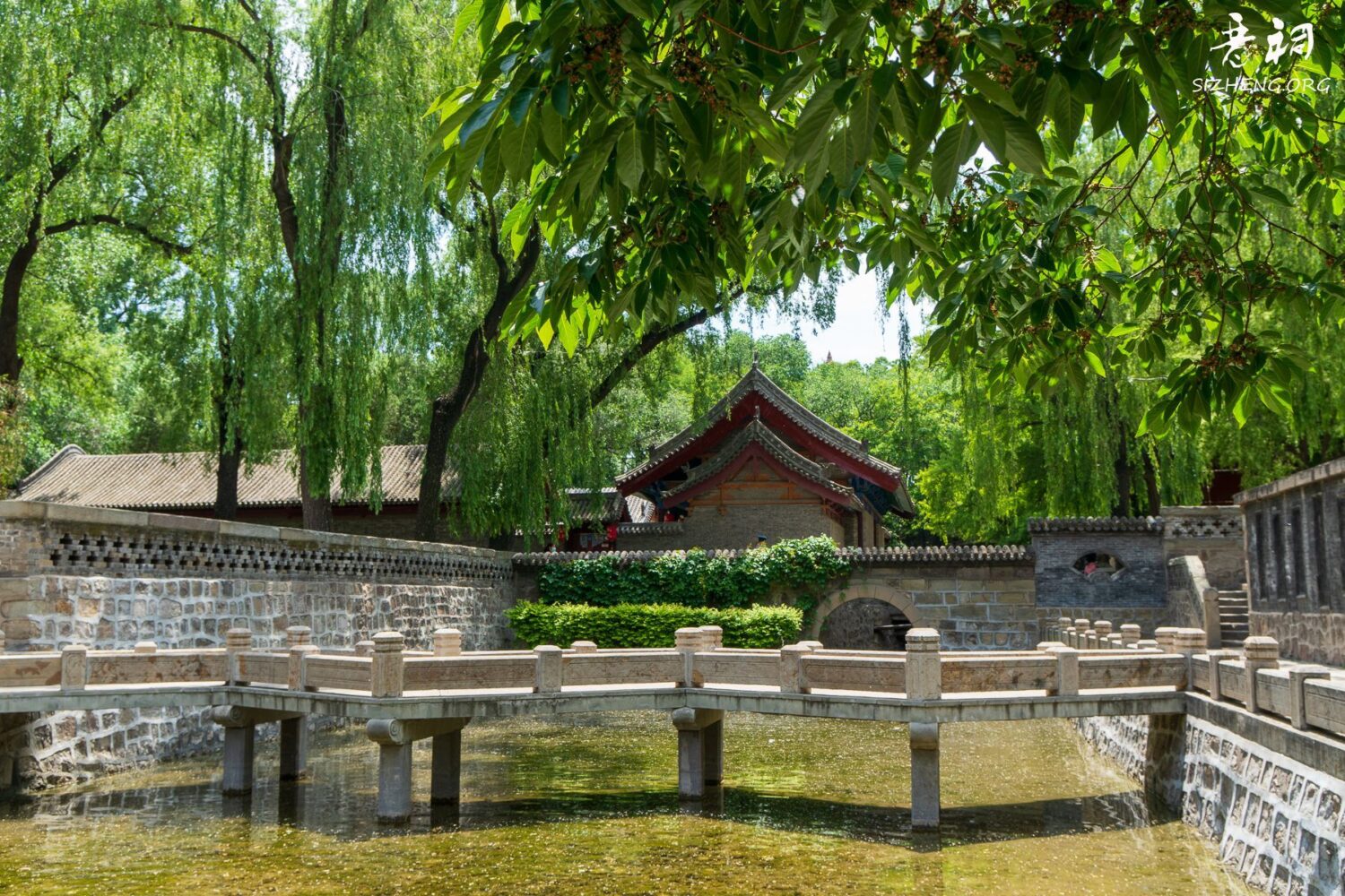 周柏前面是松水亭,面宽三间,进深两间,卷棚歇山顶。东面明间檐下的匾额是康熙长白岳礼所书“松水亭”,楹联上则写着“晋水源流汾水曲,荷花世界稻花乡”。“松水”取自王维诗句“明月松间照,清泉石上流”。