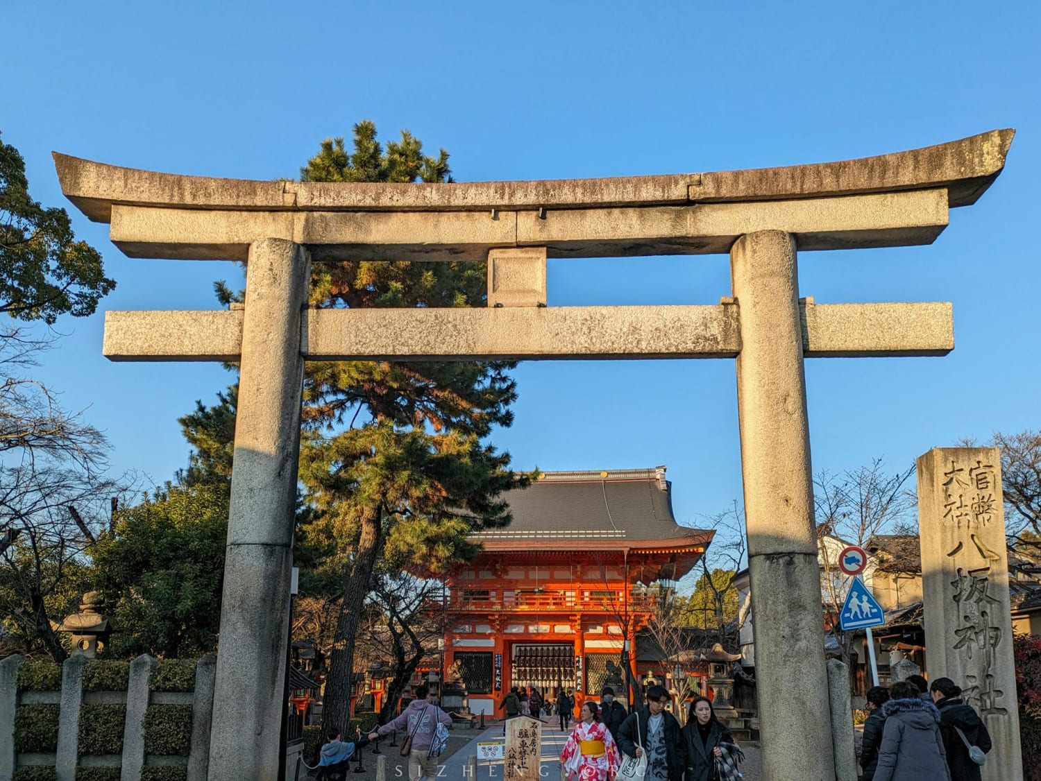 我们从日本现存最大的石制鸟居入口进,旁边还矗立着“官幣大社”的石碑,后面就是南楼门。在祗园祭期间,神轿将从这座鸟居出发。